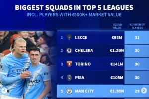 5. 曼城,13亿,29人